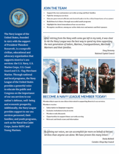 …proudly serves as the state chapter of the Navy League of the United States, a nonpartisan, civilian organization dedicated to advocating for America’s sea services—the U.S. Navy, Marine Corps, Coast Guard, and U.S. Merchant Marine.
